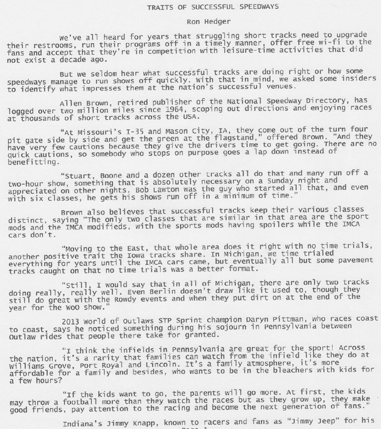 As I complete this column we are preparing to leave West Virginia for our Florida home. We arrived December 16 for what we thought would be a three week order of business preparing for Nancy’s mom to go into a nursing home. What was to be a three week stay turned into three months enduring the coldest winter in memory. If you remember the movie Groundhog Day you know how we feel. We certainly will miss all the Florida Speedweek activity and possibly the Daytona Antique Auto Racing spring event which will begin February 27. (See note at the bottom of page). Our National Speedway Ministry motorhome will need a couple of weeks of work after setting through the winter before heading out again. As we thaw out we will plan our 2014 activities. Wherever our travels lead, we hope to see you along the way. Follow us on our NationalSpeedwayMinistries.com web site. As always, God bless and see you at the races.