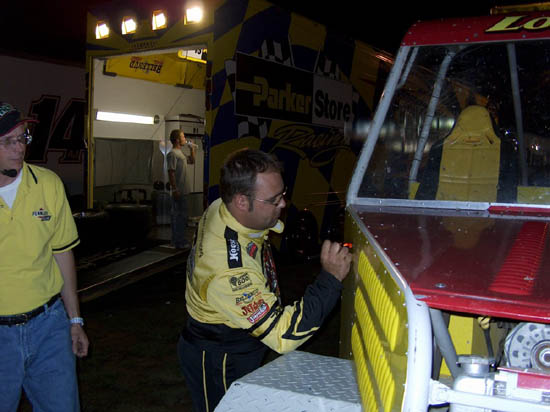 "BULLDOG II" GETS PLENTY OF ATTENTION..HERE WITH RANDY IS DRIVER DONNIE SCHATZ SIGNING THE SIDE PANEL WHICH WILL BE ADDED TO THE "BD I" PANEL ON THE SHOP WALL..(Jim Smith photo)