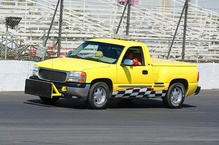ROD CARSEY IS THE LEAD PUSH TRUCK DRIVER AND A MEMBER OF THE SAFETY TEAM AT MADERA SPEEDWAY IN MADERA, CALIFORNIA..HIS TRUCK IS A 2002 GMC SIERRA WITH
